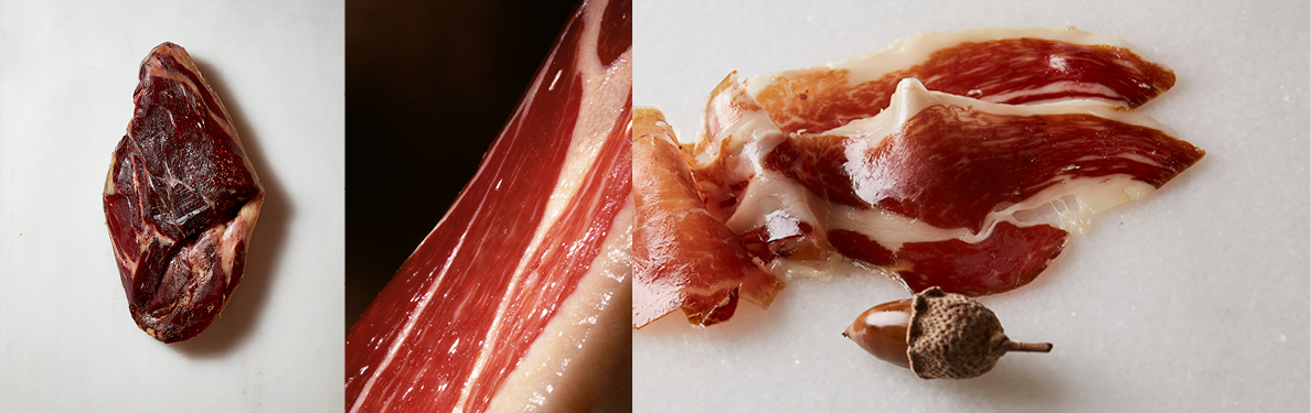Jamón de grasa brillante y transparente. Magro de color rojo cereza intenso y veteado.