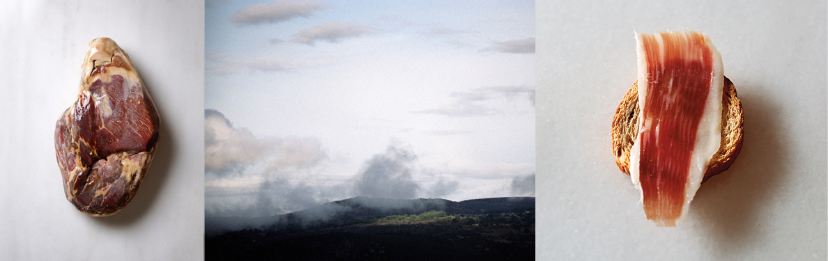 Jamón de grasa brillante y transparente. Magro de color rojo cereza intenso y veteado.