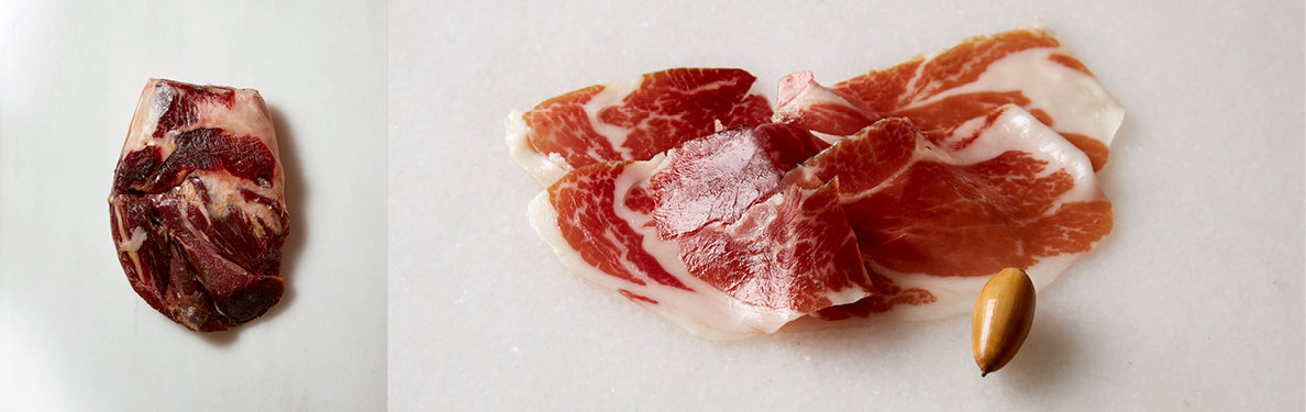Paleta de grasa brillante y transparente. Magro de color rojo cereza intenso y veteado.
